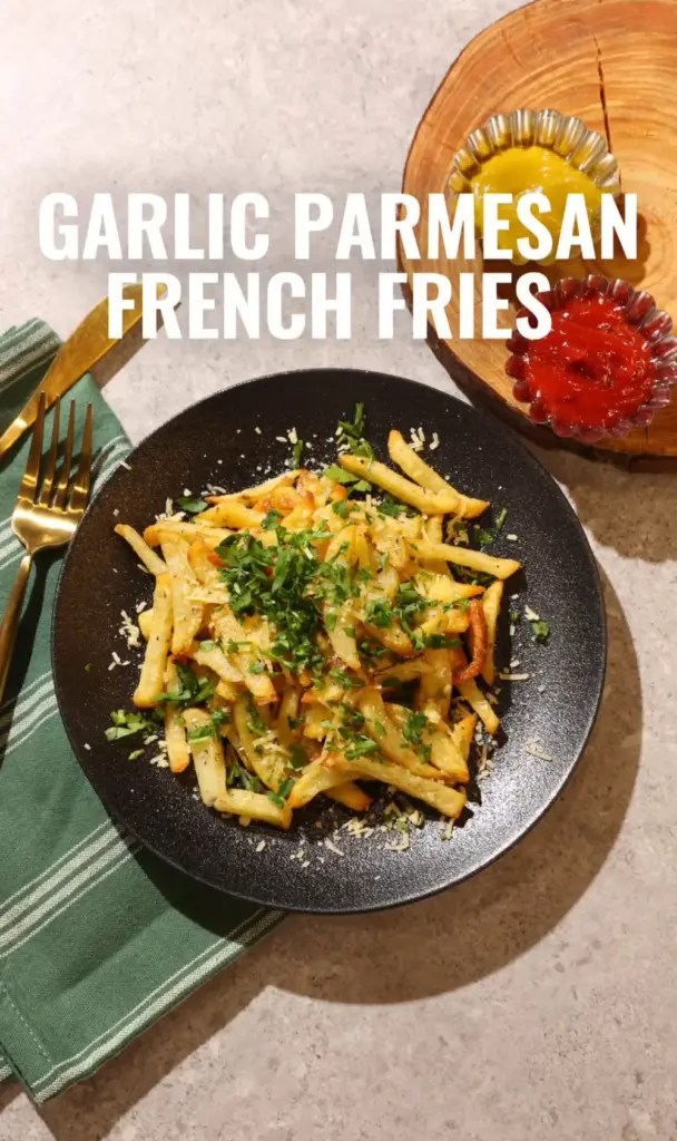 Når pommes fritesene er ferdige, legg dem i en bolle sammen med hvitløken og smelt smøret, rør til pommes fritesene er jevnt dekket.